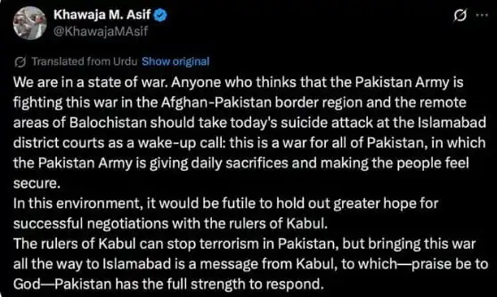 “We have been patient for long enough. If these terrorists continue to find refuge across the border, we will pay back in the same coin. Pakistan will not tolerate bloodshed orchestrated from Afghan soil.”