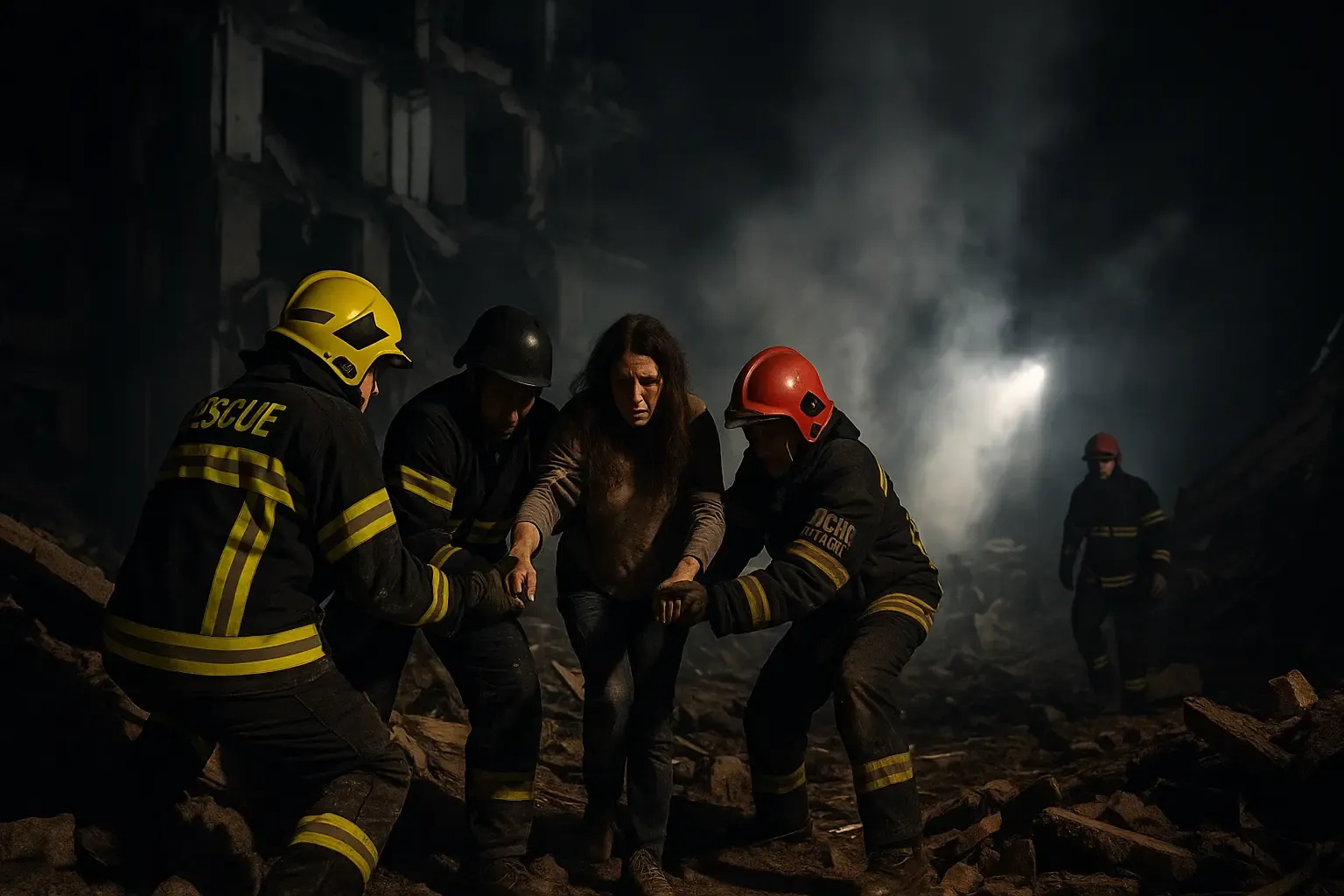 Fire brigades, search-and-rescue teams and medics worked through the night. Thermal scanners were used to identify trapped survivors within the rubble.